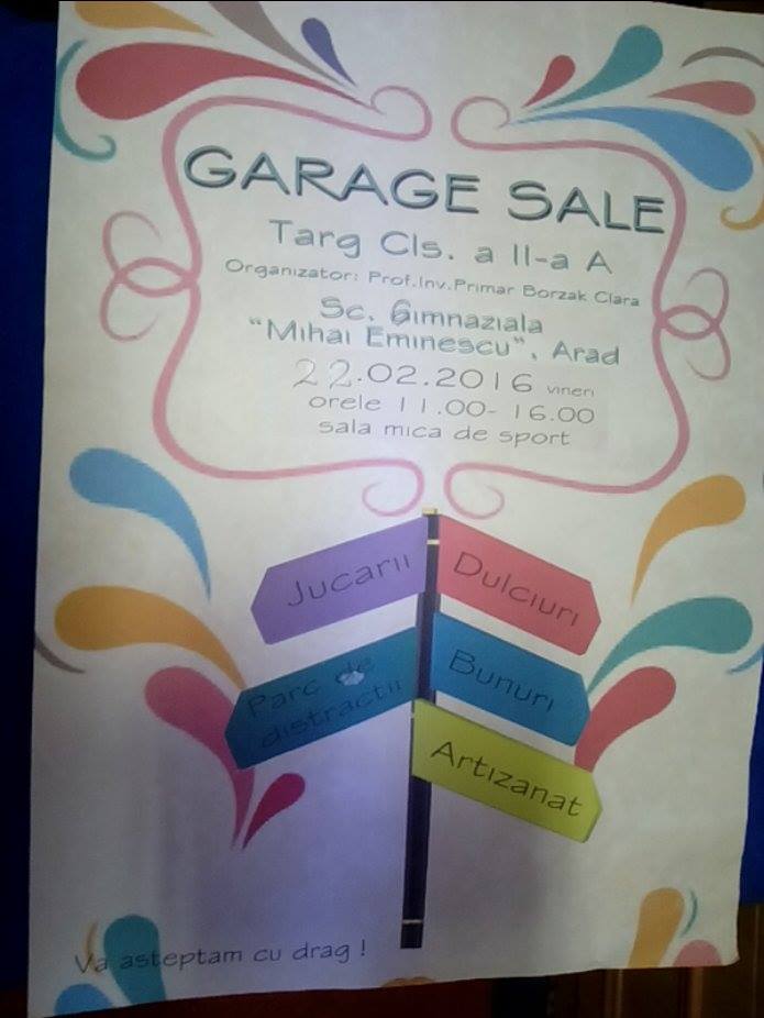 Azi a avut loc târgul clasei a II-a A, denumit generic "Garage sale". Ideea târgului a pornit de la câţiva părinţi ai elevilor clasei, care ulterior s-au mobilizat pantru ca acest târg să aibă succes. Copiii au adus de acasă jucării, cărţi, obiecte de artizanat, sucuri, dulciuri, mărţişoare. Inclusiv mămicile sau bunicile au fost implicate să prepare bunătăţi pe care elevii să le vândă. A fost montat şi un colţ de joacă pentru copii, o trambulină gonflabilă.